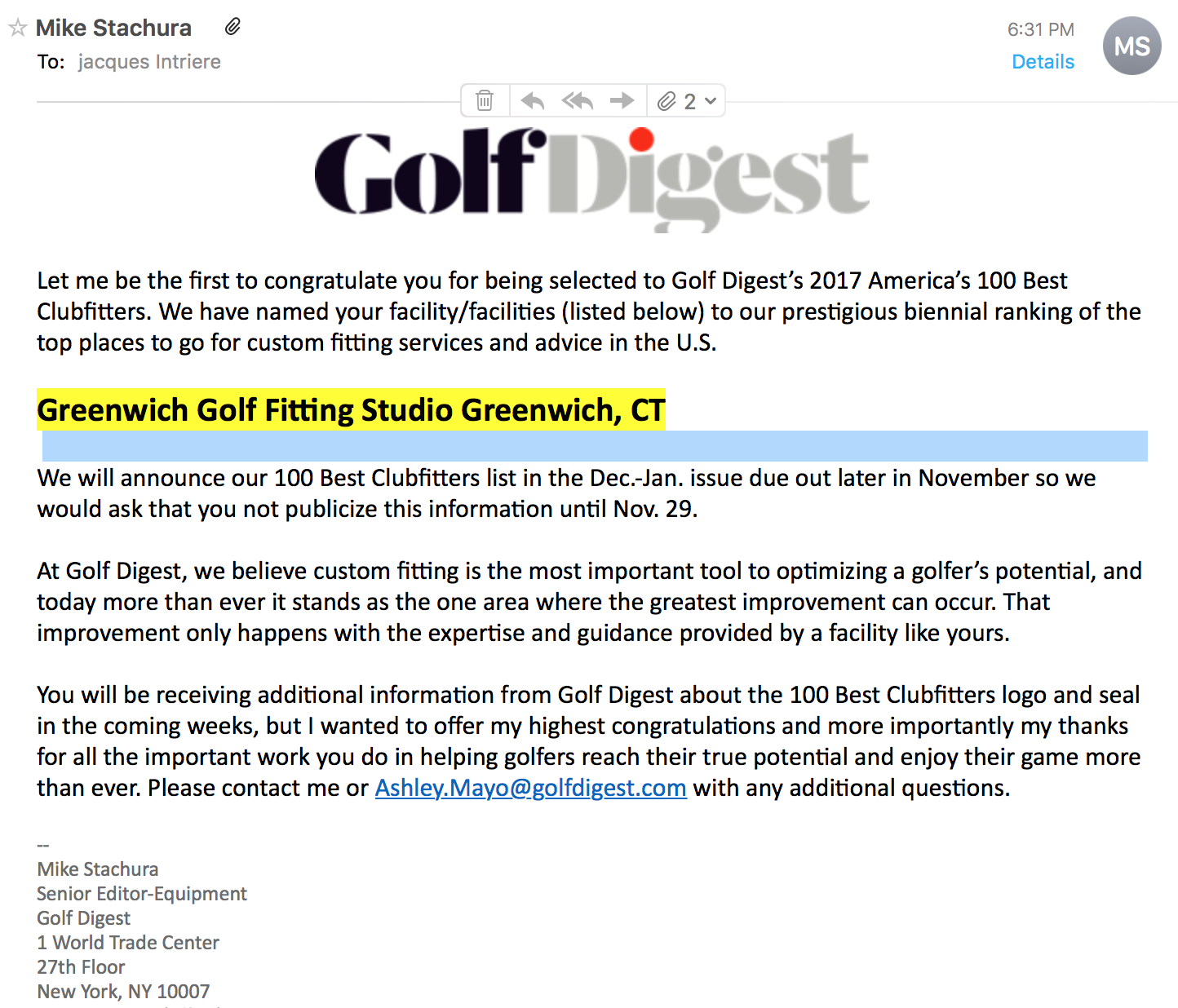 Jacques recognized as Golf Digest 2017 Best 100 America Clubfitter Share this:Share Share on LinkedIn (Opens in new window) LinkedIn Share on Facebook (Opens in new window) Facebook Share on Pinterest (Opens in new window) Pinterest Share on X (Opens in new window) X Email a link to a friend (Opens in new window) Email